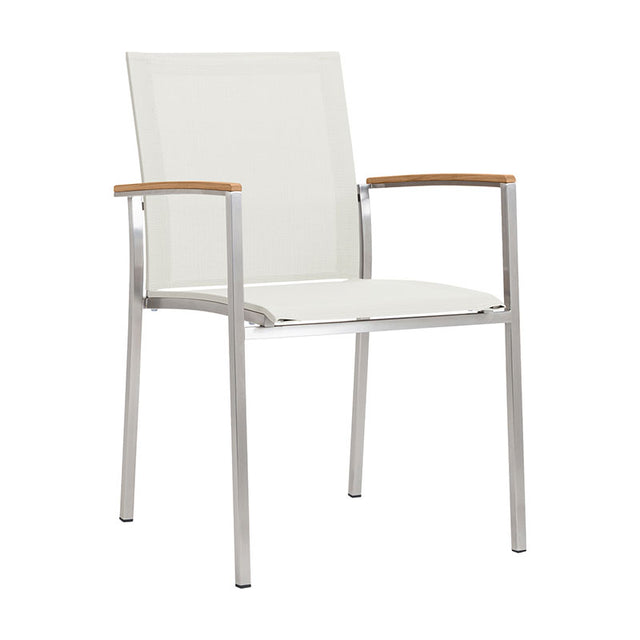 Alzette Stapelstuhl Eco Edelstahl mit Batyline und Teakholzarmlehne