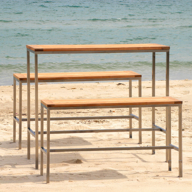 Ensemble de bar Florence 0-2 composé d'une table de bar Florence et de 2 bancs de bar Florence en teck et acier inoxydable