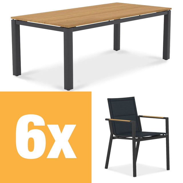 Ensemble de table à manger en aluminium Planka 210 composé d'une table à manger en aluminium Planka 210x100 en teck thermolaqué grade A brossé avec cadre en aluminium et chaises empilables Gazelig en aluminium et Batyline